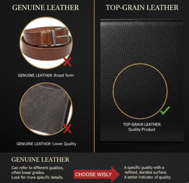 “When you shop for leather products, you should be aware of the term ‘genuine leather,’ as it can be used broadly. That means it can refer to different qualities of leather, even lower-quality options. Hence, look for more specific details, like “top-grain leather,” to ensure a quality product.”