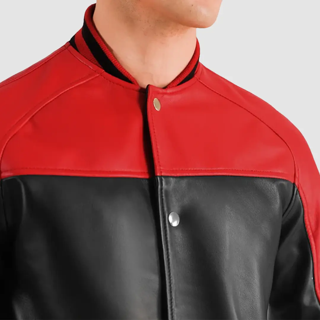 In my opinion, a black and red leather jacket works best when it looks confident but relaxed. That’s exactly what this piece delivers. The raglan sleeves give you room to move. Rib-knit cuffs lock in warmth. And the leather shell adds attitude without trying too hard.
