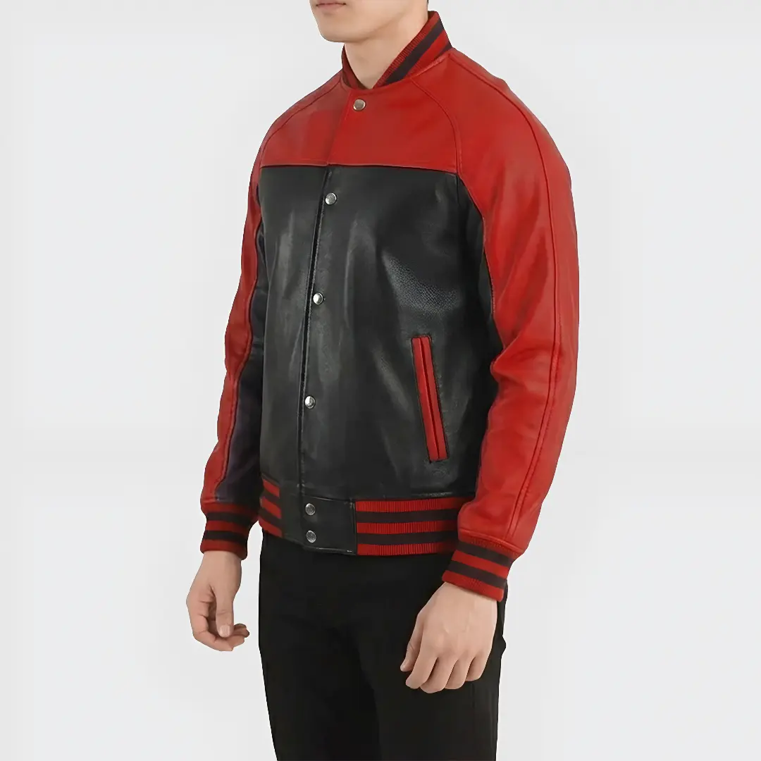 You throw on a Black and Red Leather Varsity Jacket, and suddenly the outfit feels alive. I think that contrast does the magic. Red brings energy. Black keeps things grounded. Together, they hit that sweet spot between bold and effortless.