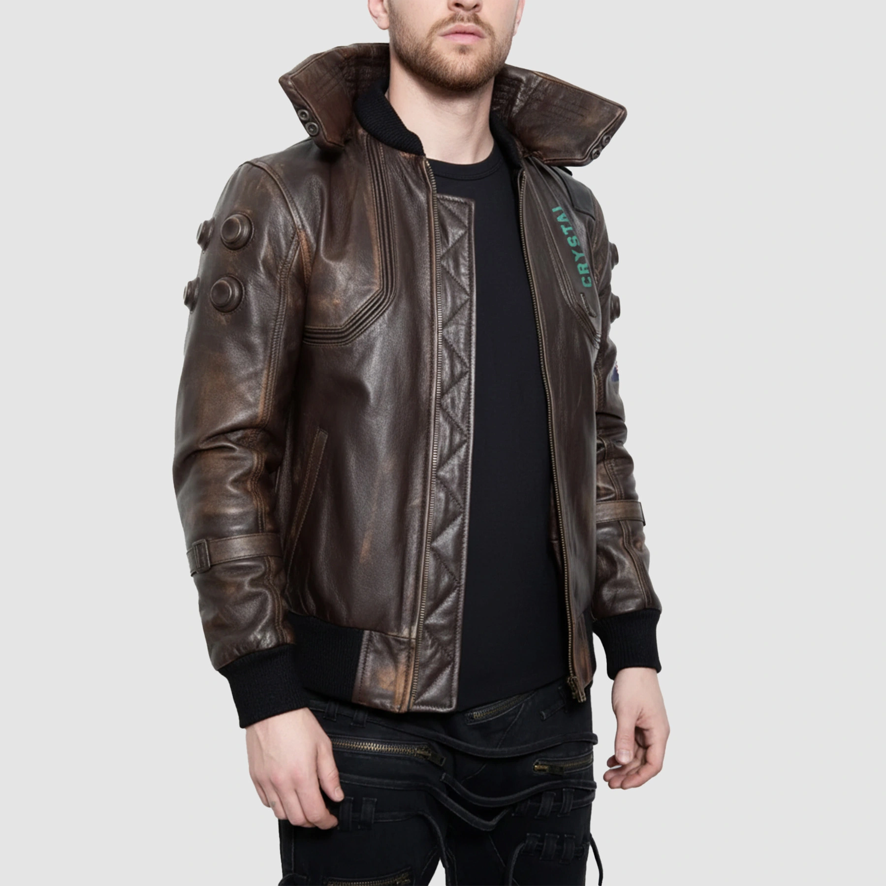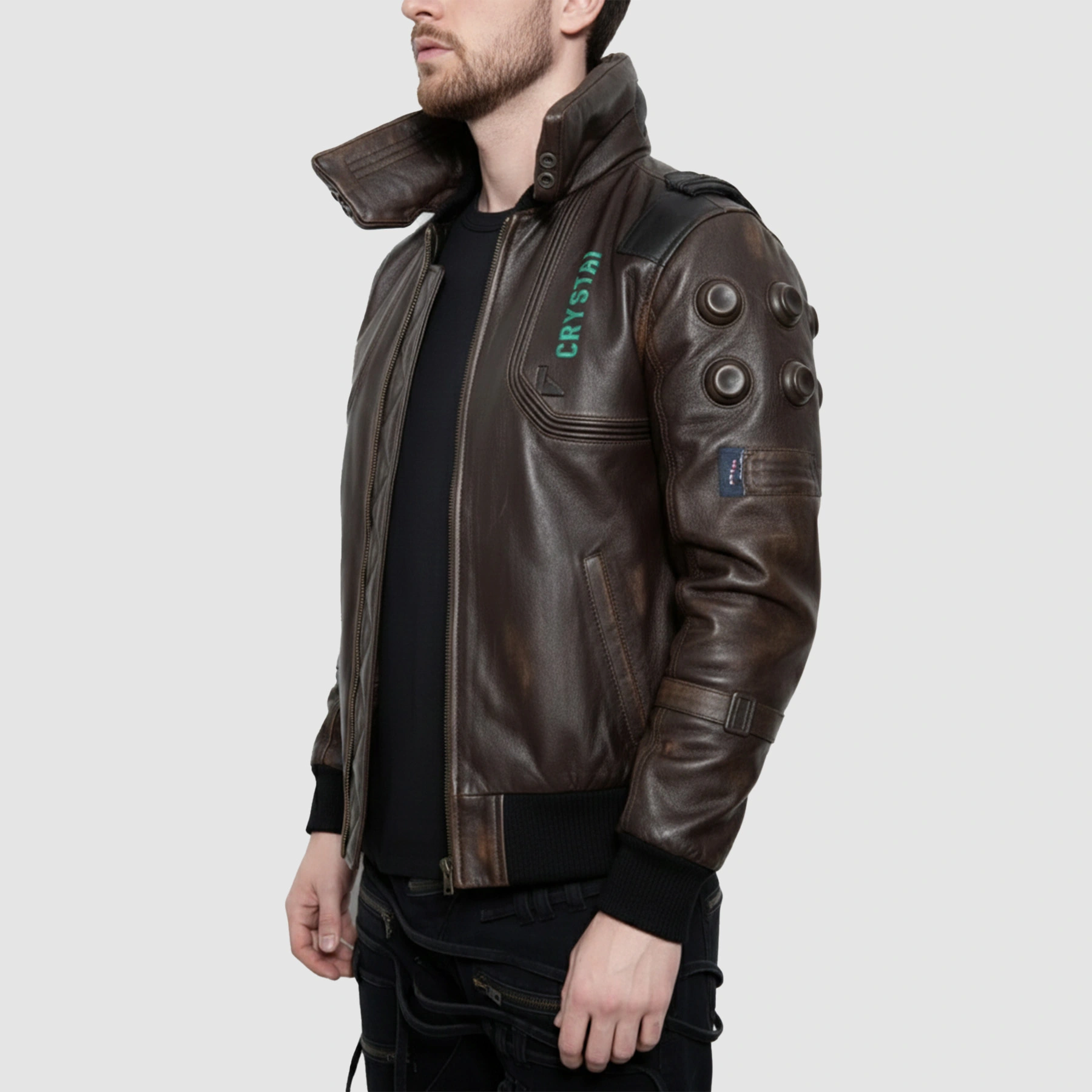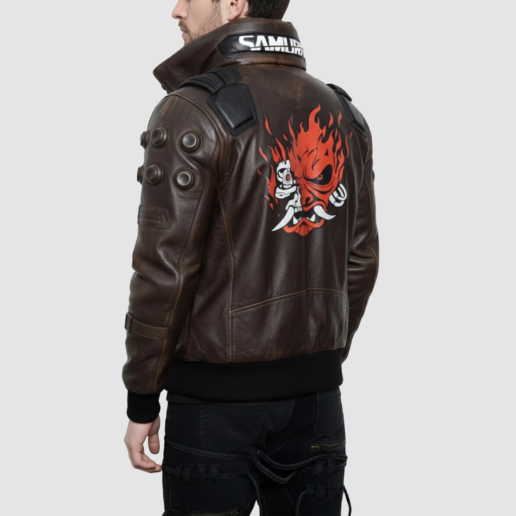 The cyberpunk 2077 bomber jacket features genuine brown leather that feels soft but tough enough for everyday wear. I think the texture and color bring out that raw, authentic look you see on Johnny Silverhand’s jacket in the game. If you’re wondering where to get a samurai jacket cyberpunk 2077, this piece is an unbeatable choice that captures the spirit of V’s adventures perfectly.