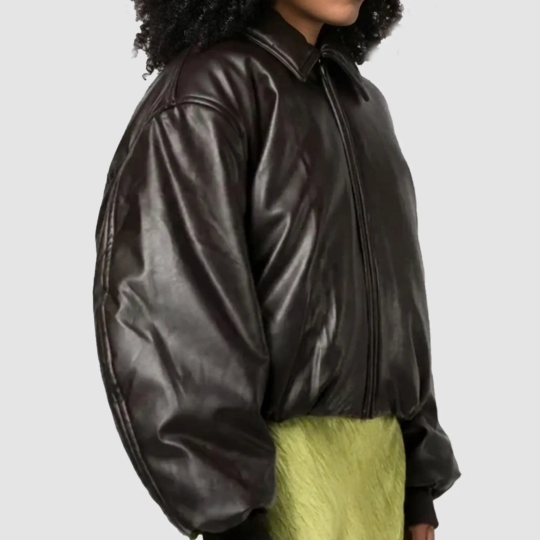 The Molly Mae leather bomber jacket hugs your shoulders in just the right way, with rib-knitted cuffs keeping the chill out. Snap it up with the smooth zipper closure, and suddenly your outfit feels complete. You’ll notice the clever pockets too—two on the waist and one inside for your essentials.