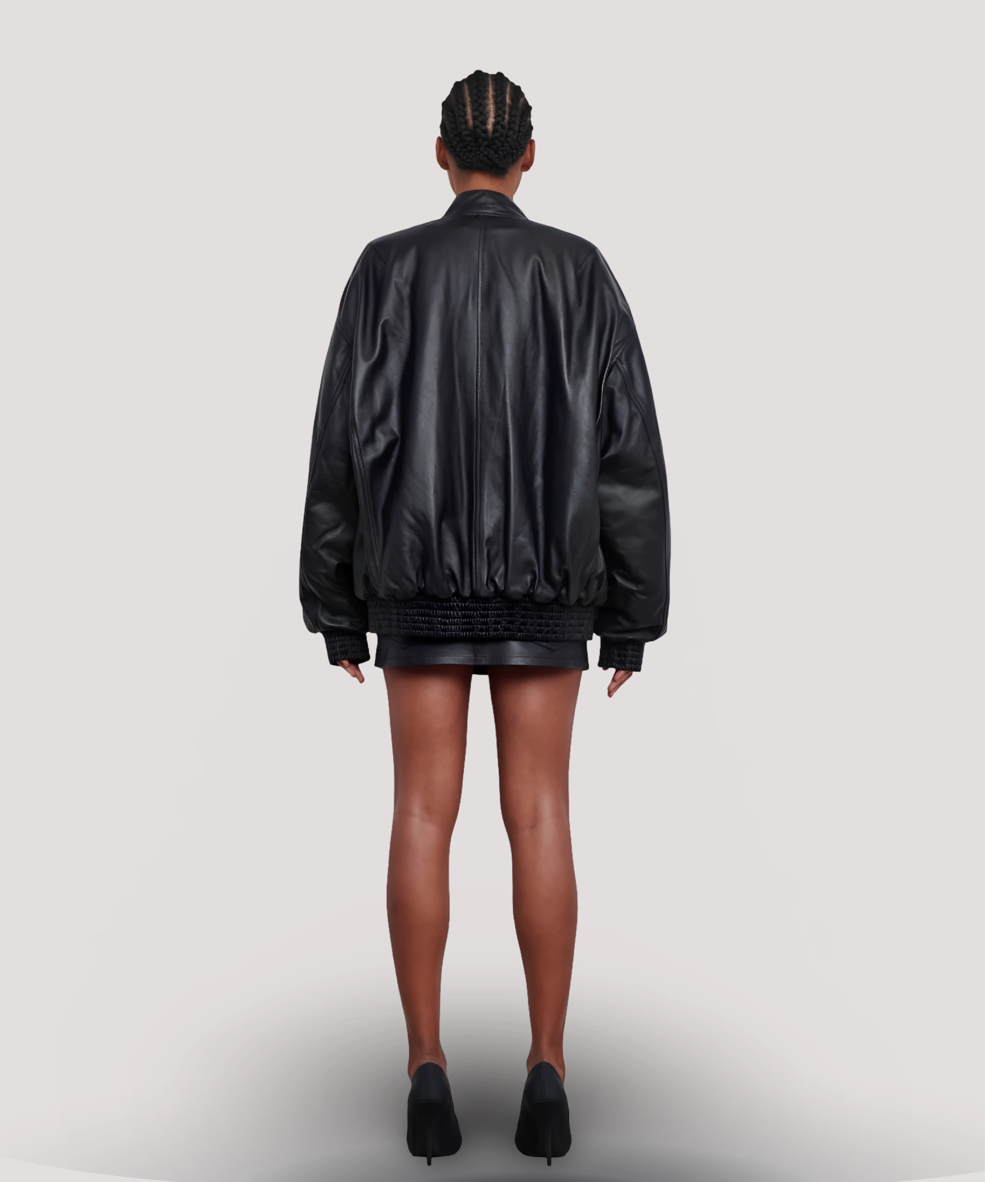 Oversized black leather bomber jacket with a modern, relaxed silhouette